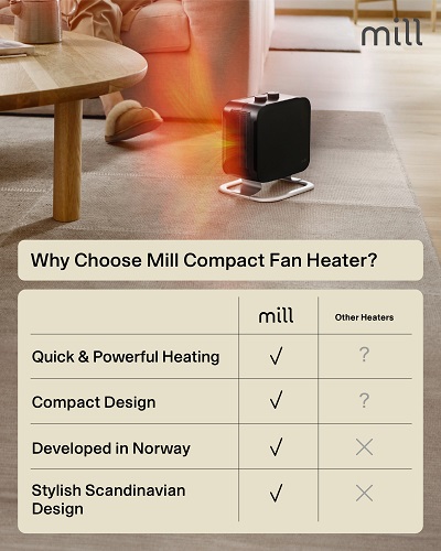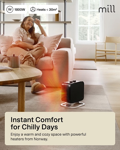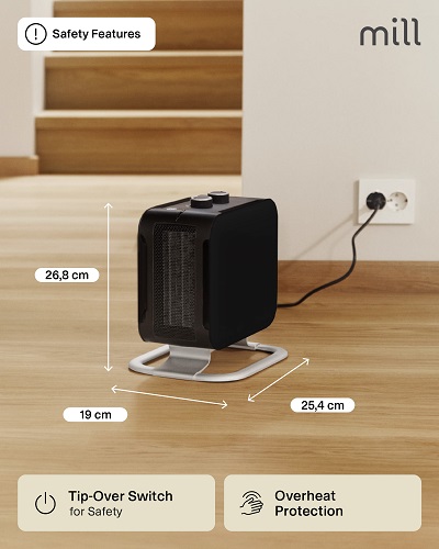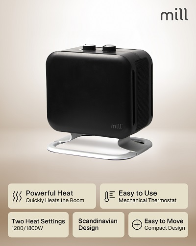 Keramiskais sildītājs Mill Compact ir mazs un efektīvs ventilatora sildītājs, kas ietērpts elegantā izskatā. Sildītāja maigās, noapaļotās malas un gludi izliektās malas izceļ minimālistisko skandināvu stilu un padara to dabiski iederīgu jebkurā mājoklī.