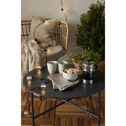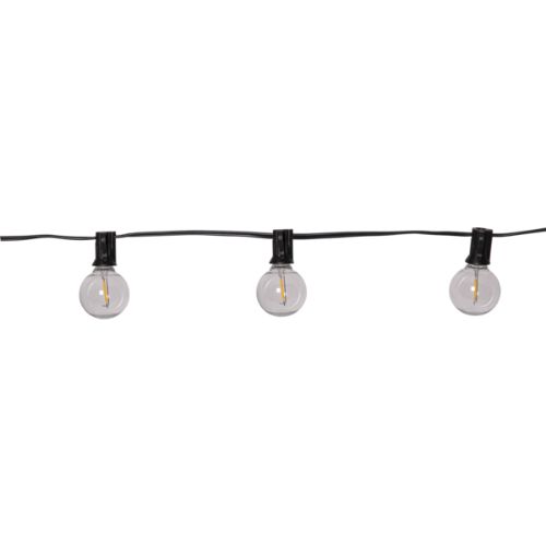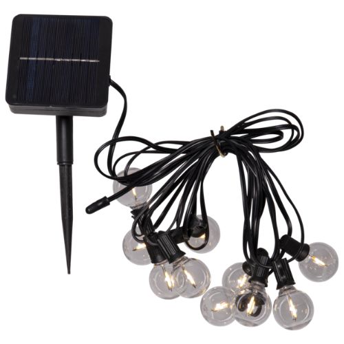 LED Saules gaismas virtene Globe Mini ar 10 mazām, caurspīdīgām bumbiņām (aptuveni 4 cm diametrā). Attālums starp tām – 30 cm. Tā spīd ar silti baltu LED gaismu, radot patīkamu atmosfēru tumsā. Ideāli piemērota dārzam, balkonam vai terasei. Saules panelis atrodas 2 m attālumā no virtenes, ļaujot to ērti novietot saulainā vietā, lai nodrošinātu pilnu uzlādi.