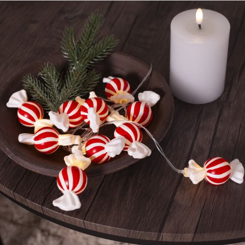 LED gaismas virtene no ražotāja Star Trading. Virtene sastāv no 10 gaismekļiem, kofekšu formā, sarkana ar baltu. Virtenei ir taimera funkcija, darbojas uz 2xAA baterijām. Skaista virtene Ziemassvētku eglei, galda dekoram vai vienkārši jebkur Jūsu mājas.