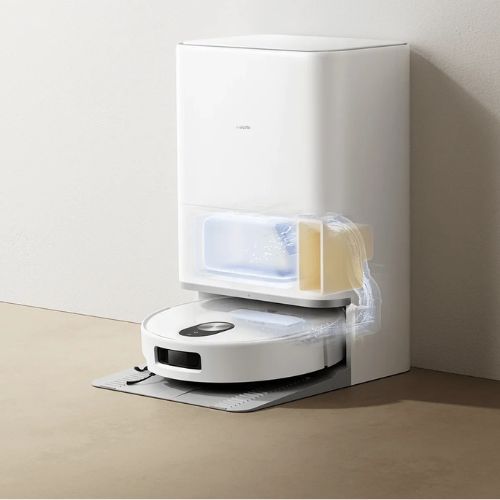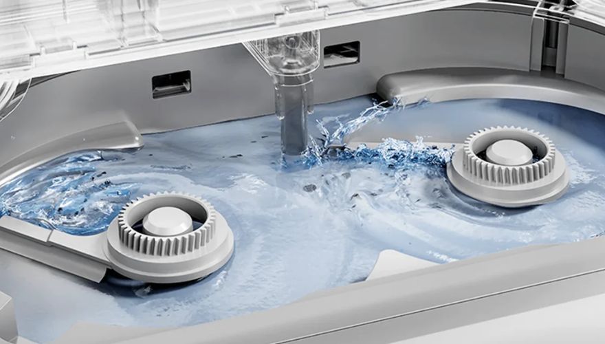 Bāzes stacija, kas aprīkota ar diviem rotējošiem skrāpjiem, var ne tikai savākt putekļus un notīrīt mopa pamatni, bet arī nokasīt un notīrīt mazgāšanas dēli mopa mazgāšanas laikā, samazinot nepieciešamību pēc manuālas apkopes.